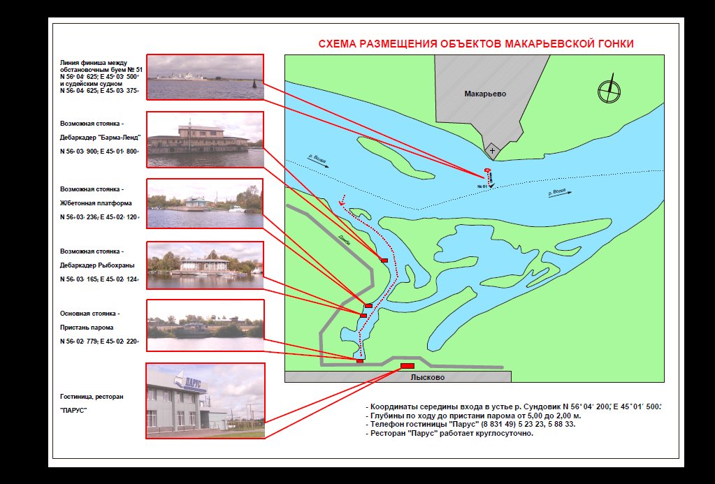 Устье реки позволяет пройти яхтам до причала паромной переправы Лысково — Макарьев. Были достигнуты договоренности с капитаном парома о швартовке яхт за паром на стоянку 15 сентября и о проведении вечерней церемонии награждения в ресторане-гостинице «Парус» - 50м от парома.