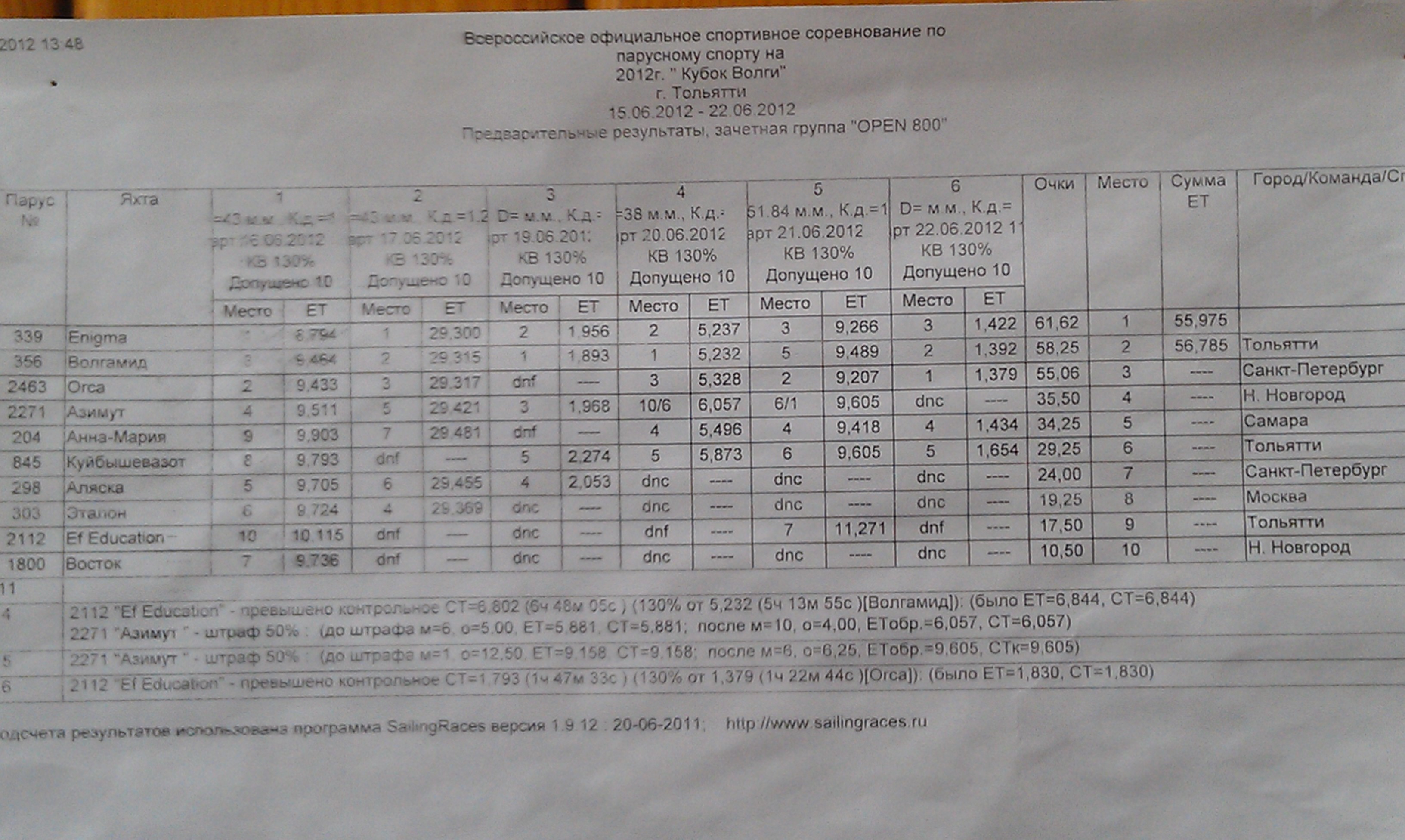 Маршрут гонки 2 - Сенгелей - буй 31 - Тольятти. Ветер 10-11 м/с. В районе финиша на порыве до 13-14 м/с Восток сломал мачту. Причина - обрыв тали ахтерштага.