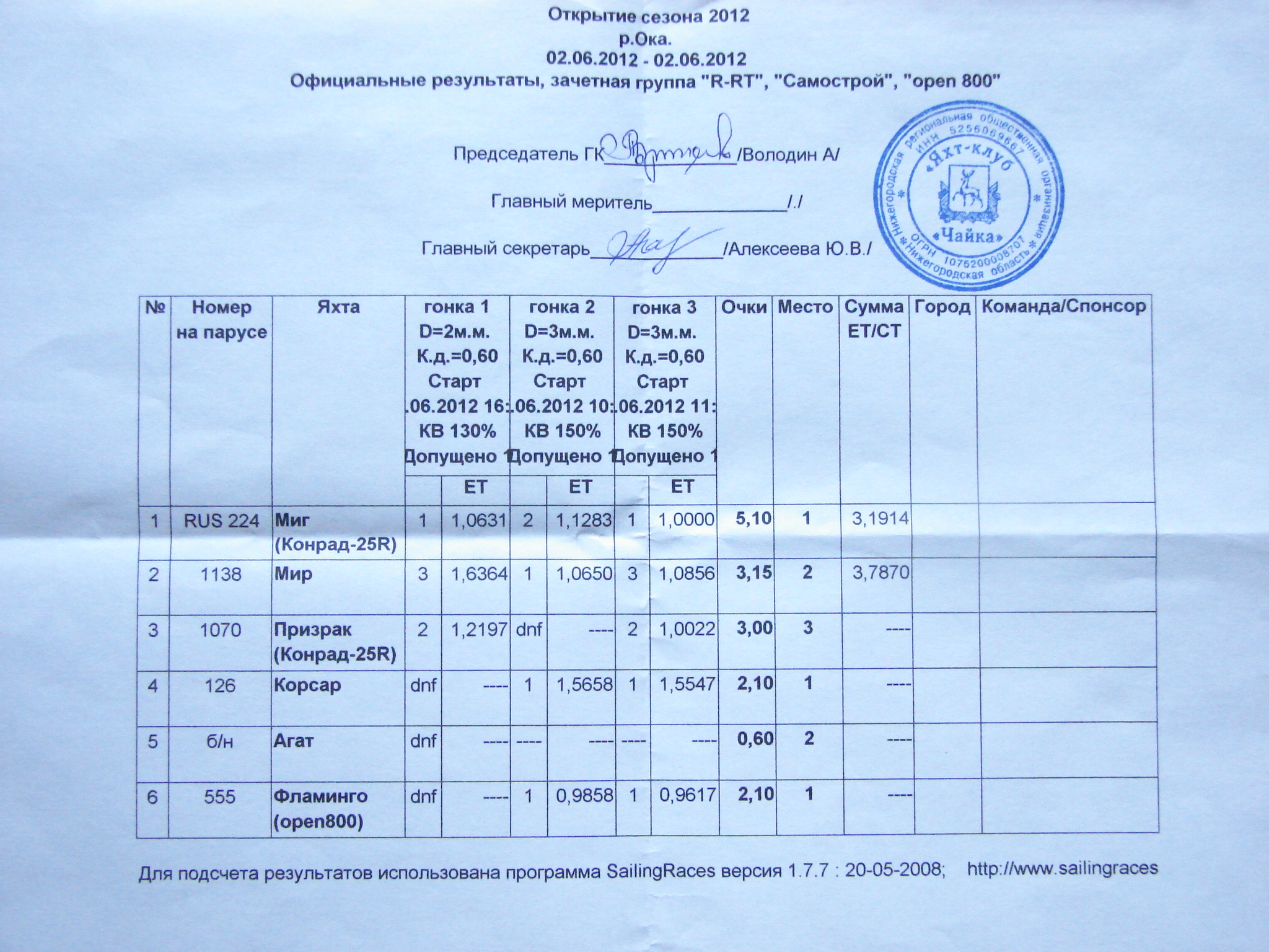 Первая в сезоне 2012 года парусная регата крейсерских яхт проводилась на Оке второго и третьего июня. Гоночная дистанция располагалась в акватории белых навигационных бакенов с номерами 3 и 6. По-летнему тёплая погода, с ласковым солнышком и беззаботным ветерком, помогала участникам готовиться к стартам. Яхты буквально оживали после зимнего отдыха, спокойно и важно покачиваясь на швартовых у пирса. Спортсмены проверяли и настраивали такелаж, разворачивали спрятанные в кисах паруса, брасы...