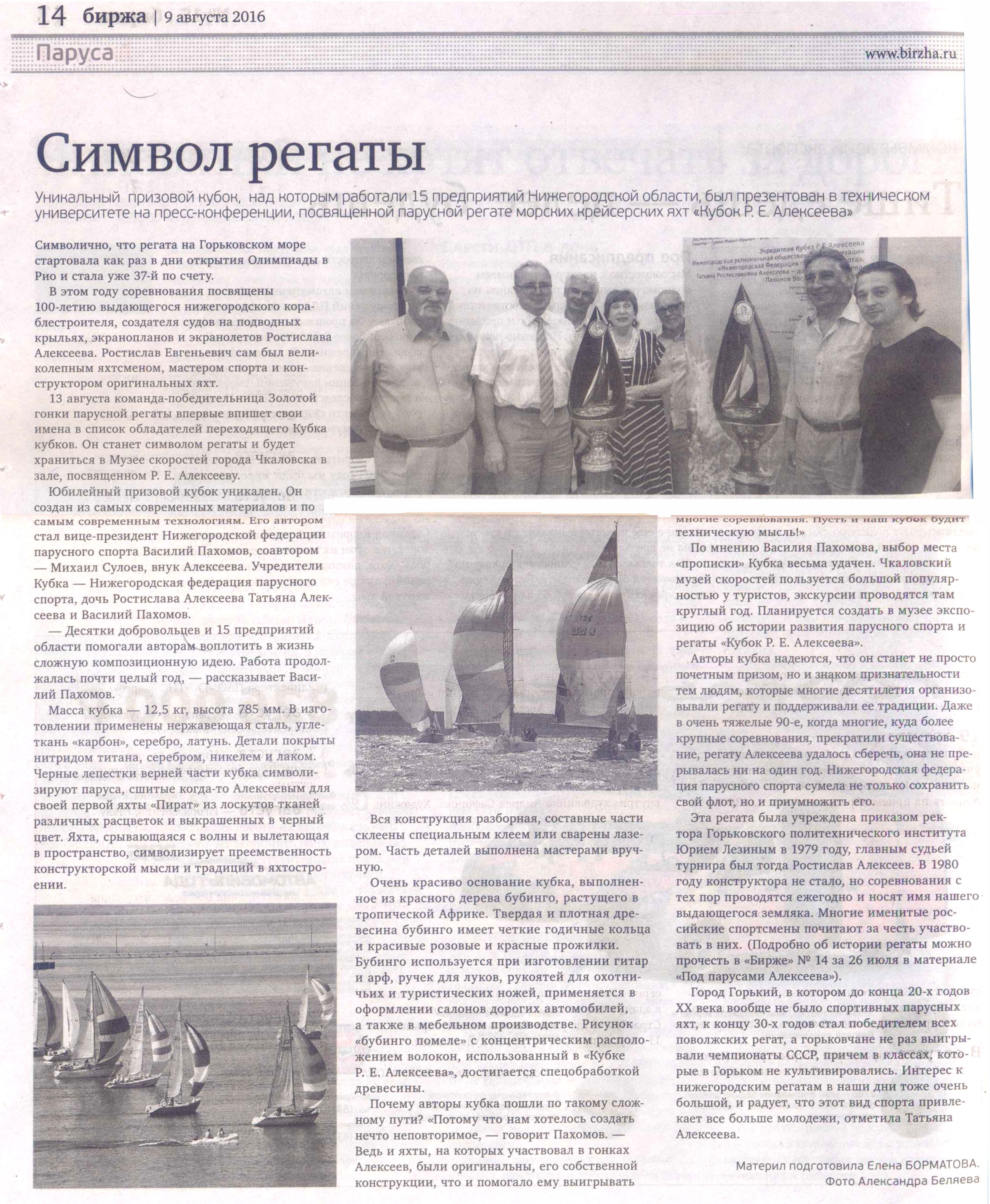 Газета "Биржа" 9 августа 2016 "Символ регаты"